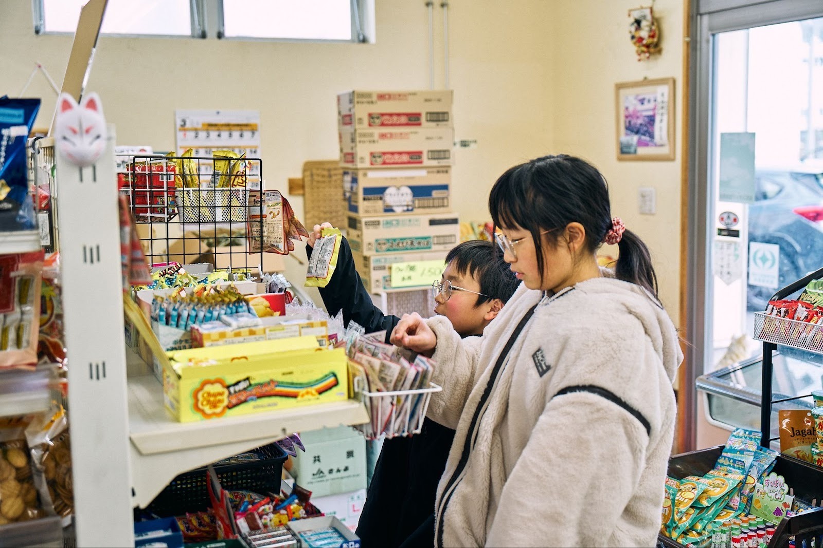 最初に向かったのは、地元で親しまれている「スーパーとさわ」。駄菓子コーナーの前に立つと、真剣なまなざしでお菓子を選びはじめる。店主の戸澤さんが見守る中、どれにしようかと悩む時間もまた楽しいひとときだ。「子どもたちがキラキラした笑顔でお菓子めがけて来てくれる。そんな日常が、私のかけがえのない時間でもあるんです」と戸澤さん。