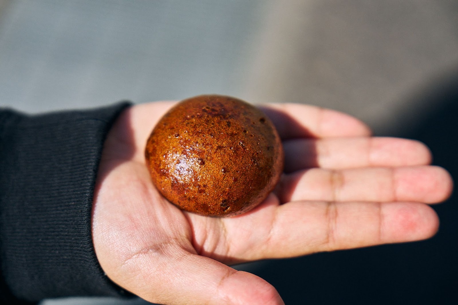 船引町特産のエゴマを使って作られたかりんとう饅頭は、外はカリッと香ばしく、中はしっとりとしたこしあん。ひと口食べると、かりんとうのほろ苦い甘さとあんこのやさしい甘みが広がる。